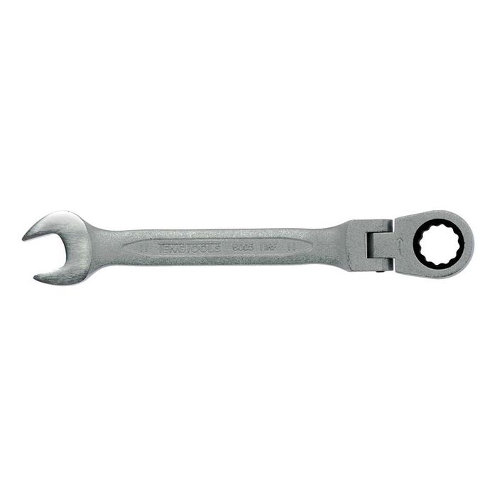 Flat type non-reversible ratchet spanner. Combined ring/open ended spanner and 12 point ring ratchet with 180deg flexible joint. 72-tooth, 5deg movement. Same dimensions at both ends. Chrome vanadium. Satin finish.