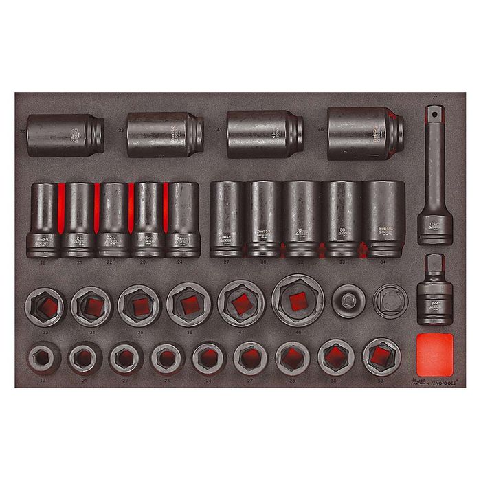 Deep sockets: 19, (3/4"), 21, 22, 23, 24, 27, (1-1/16"), 30, (1-3/16"), 32, 33, 34, (1-11/32"), 36, 38, (1-1/2"), 41 & 46mm (1-13/16")