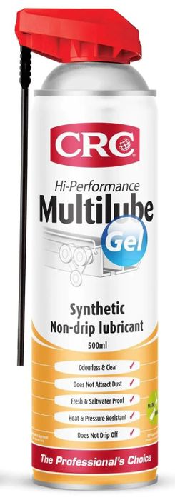 CRC Multilube Gel is a unique synthetic penetrating gel specifically formulated to provide a clean, odourless lubricant for high-pressure and high-temperature applications. It contains friction modifiers, anti-wear additives and tacking agents, does not drip off or fling off at high speed and resists hot and cold wash-off for long-lasting protection. It is ideally suited for highly loaded reciprocal moving parts and for general use in heavy industries, workshops, automotive and around the home workshop.Applied as a clear oil with excellent capillary action CRC Multilube Gel penetrates quickly into tight areas before solvents evaporate leaving a waterproof load bearing gel that stays in place and withstands high pressure and shock load conditions. The speedy shift in viscosity provides both, excellent penetration action and premium staying power.Temperature range from -35°C to +300°C.
