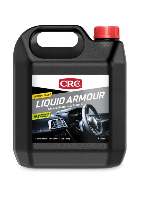 Car Leather and vinyl seats and upholstery, vinyl tops, dashboards, tyres, rubber mats, chrome. Home and Office Leather and vinyl chairs, luggage, wood furniture, plastic, stereo/TV equipment, shoes, handbags, fibreglass. Sporting Goods including golf bags, gun stocks, skis, flippers, wet suits. Not suitable for floors, stairs or fabric or two-wheel vehicles and should be sprayed onto applicator such as rag etc and not directly on vehicle equipment. CRC Liquid Armour should be sprayed onto a dry, clean cloth/microfiber towel or similar, and not directly onto plastic surfaces.