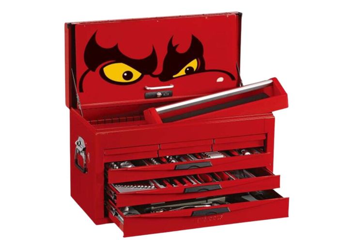 140 piece service kit containing 1/4", 3/8" and 1/2" socketry, spanners, pliers, screwdrivers, also including the TTPS09 tray set with adjustable wrenches, power grip pliers, utility knife, hack saw, hammers, a measuring tape and a steel rule. Supplied with the 8 series TC806NF 8-Series ball bearing slide top box with combination lock.